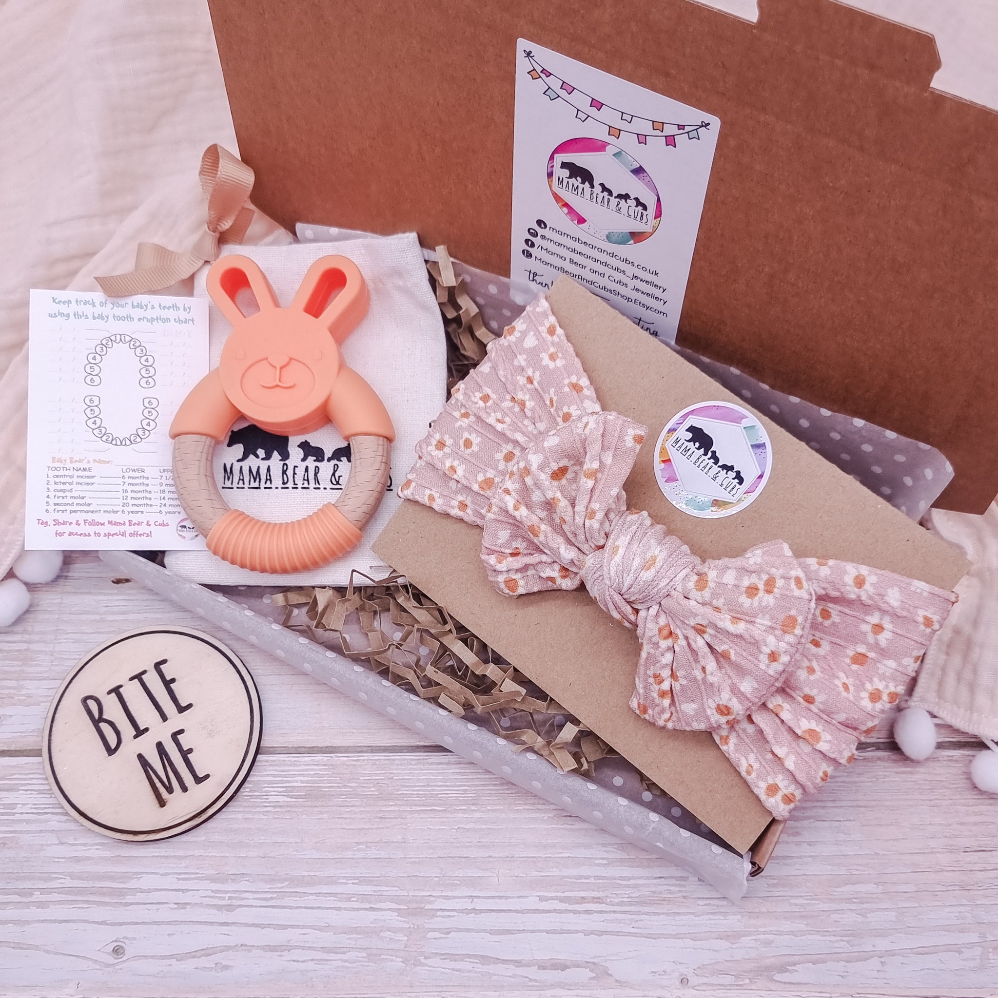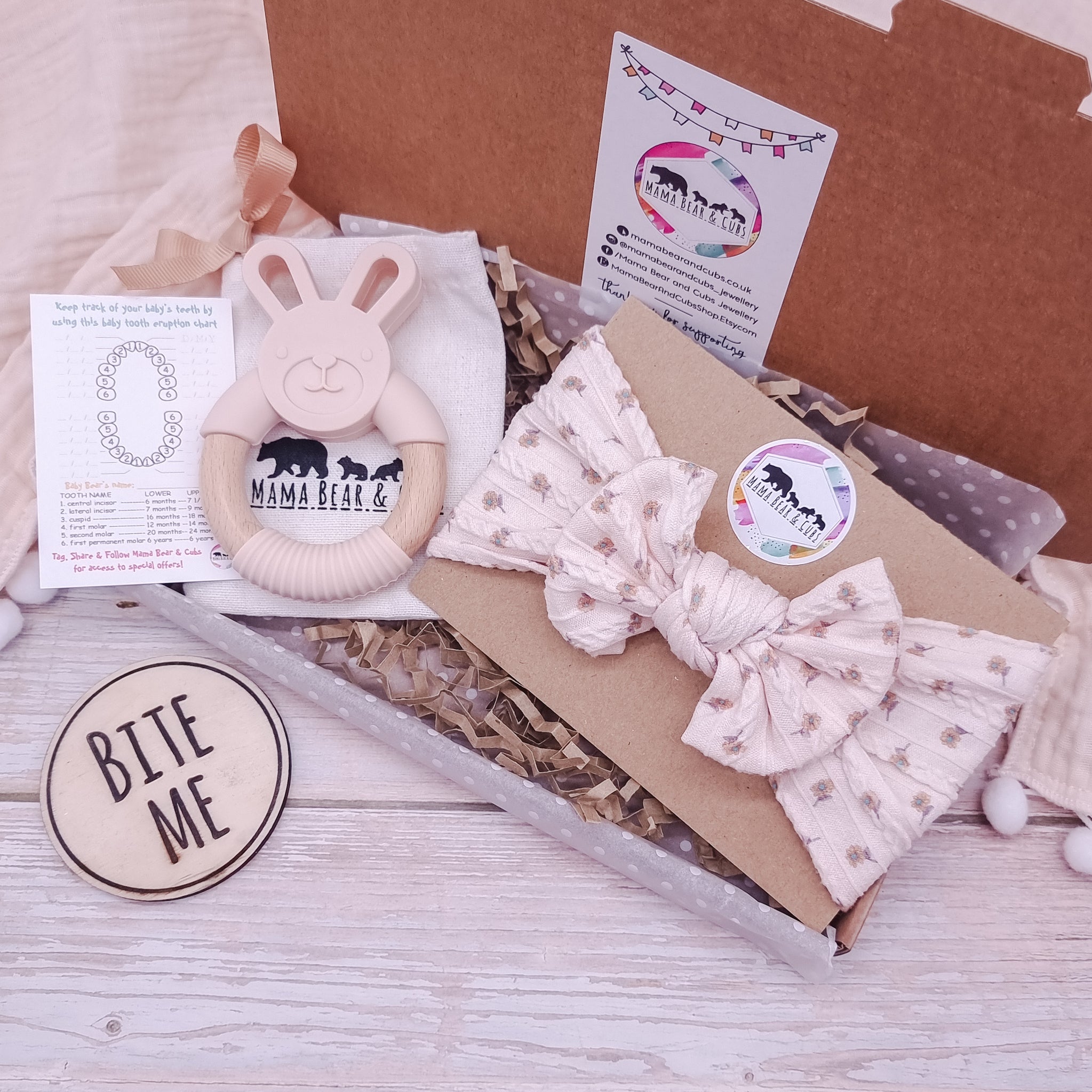Beautiful boho, neutral colours & pretty patterned bow bundle of 3. Fit 0-4 years. Option to add on silicone animal teether for only £5!