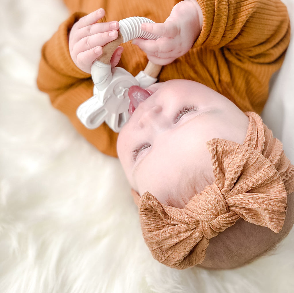 Beautiful neutral colours & pretty patterned bow bundle of 6. Fit 0-4 years. Option to add on silicone animal teether for only £5!