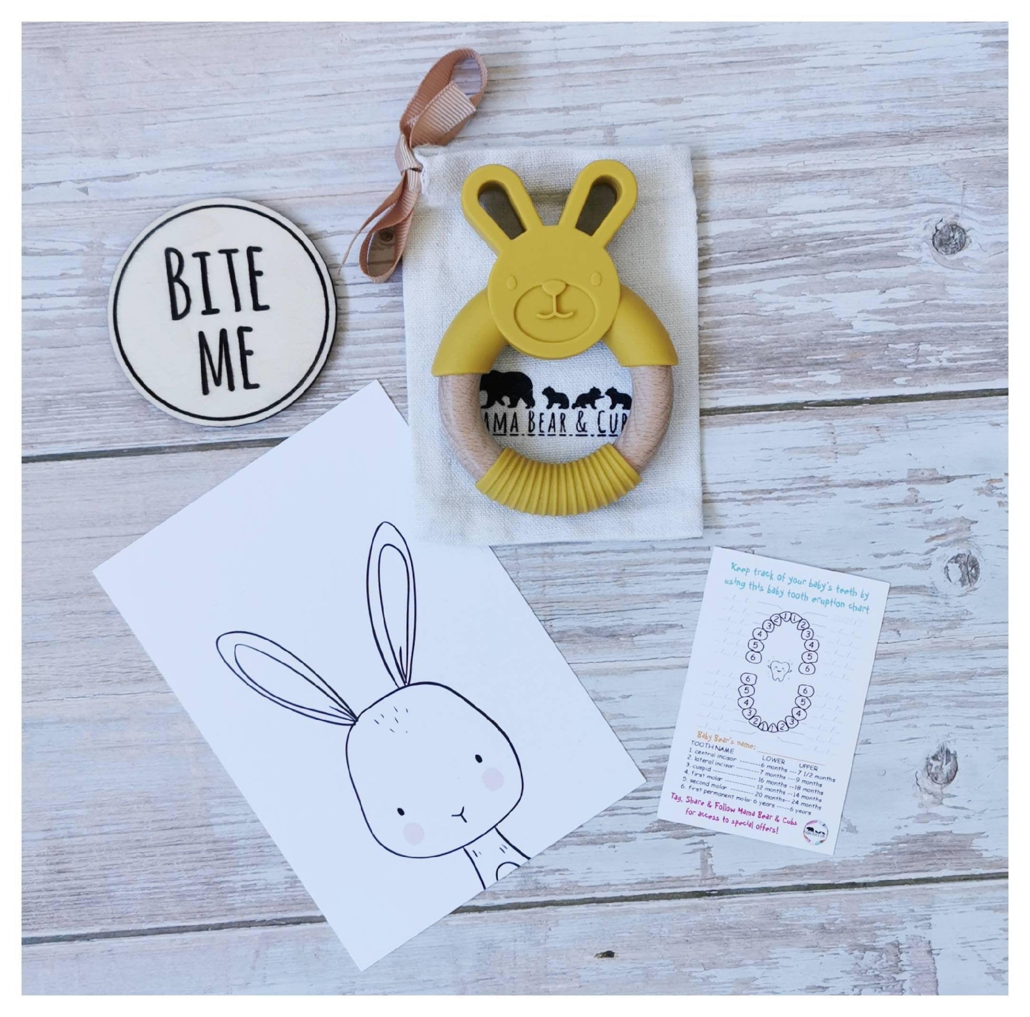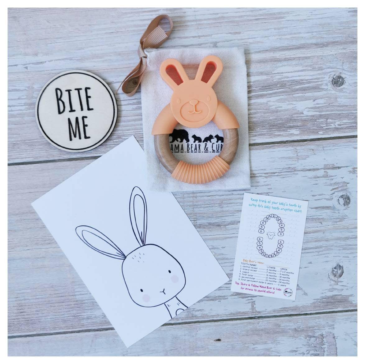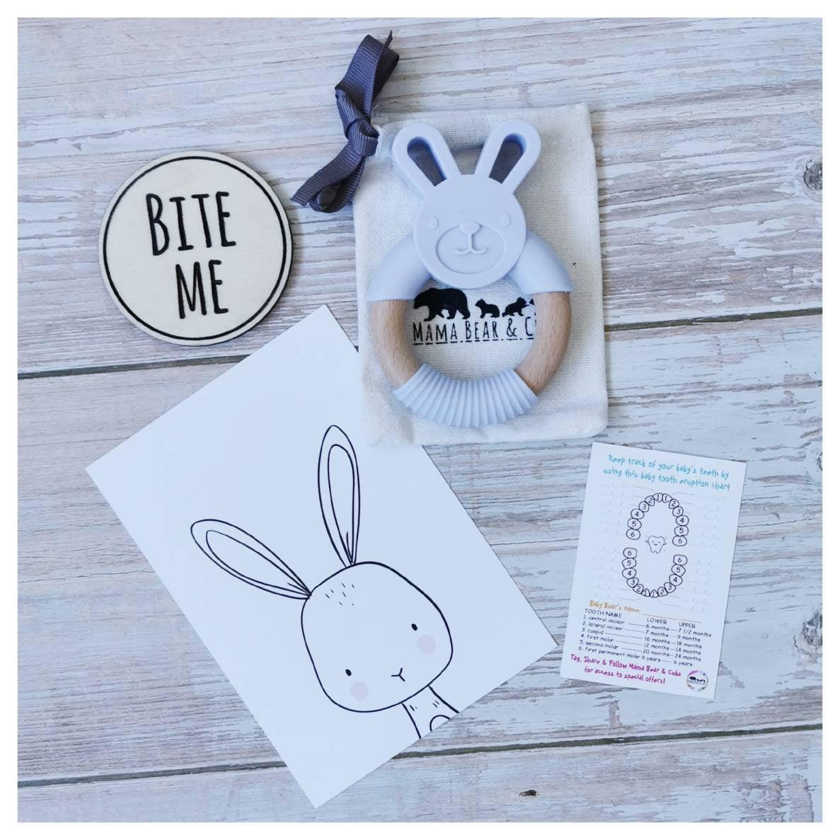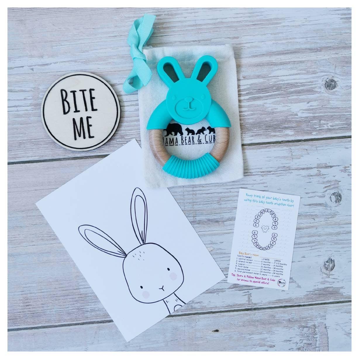 Each teether comes with a soft cotton bag with our logo on to store away when not in use. You will also receive a baby tooth eruption chart which allows you to keep a record of when your babies teeth come through, as well as giving you a guide to what age you should expect certain teeth to erupt. This makes a nice keepsake for any Baby Record Book.