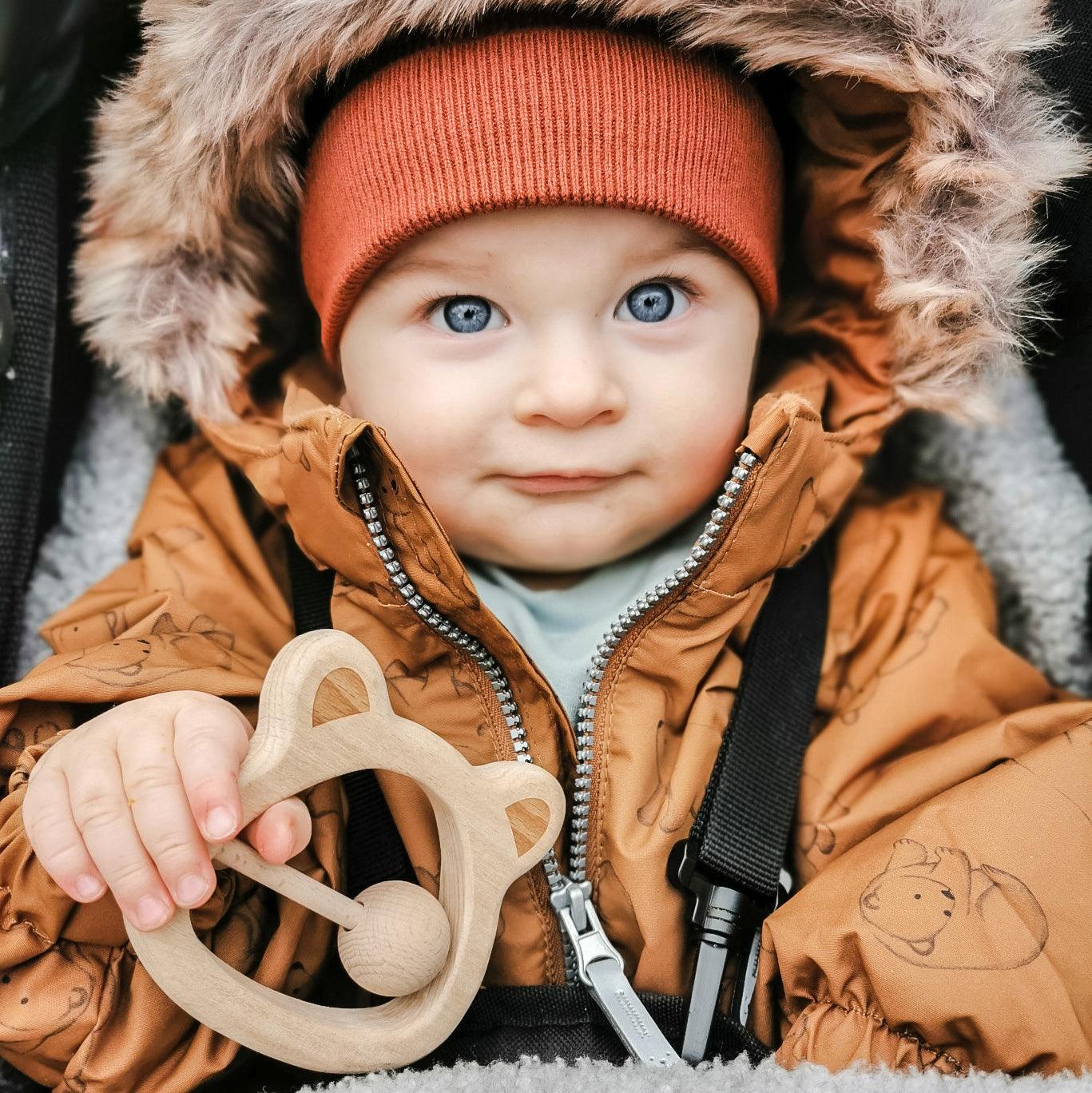 This bear is made from 100% natural beech wood, sanded smooth & certified safe to chew the hardness of the wood relieves pressure and helps budding teeth pop through.