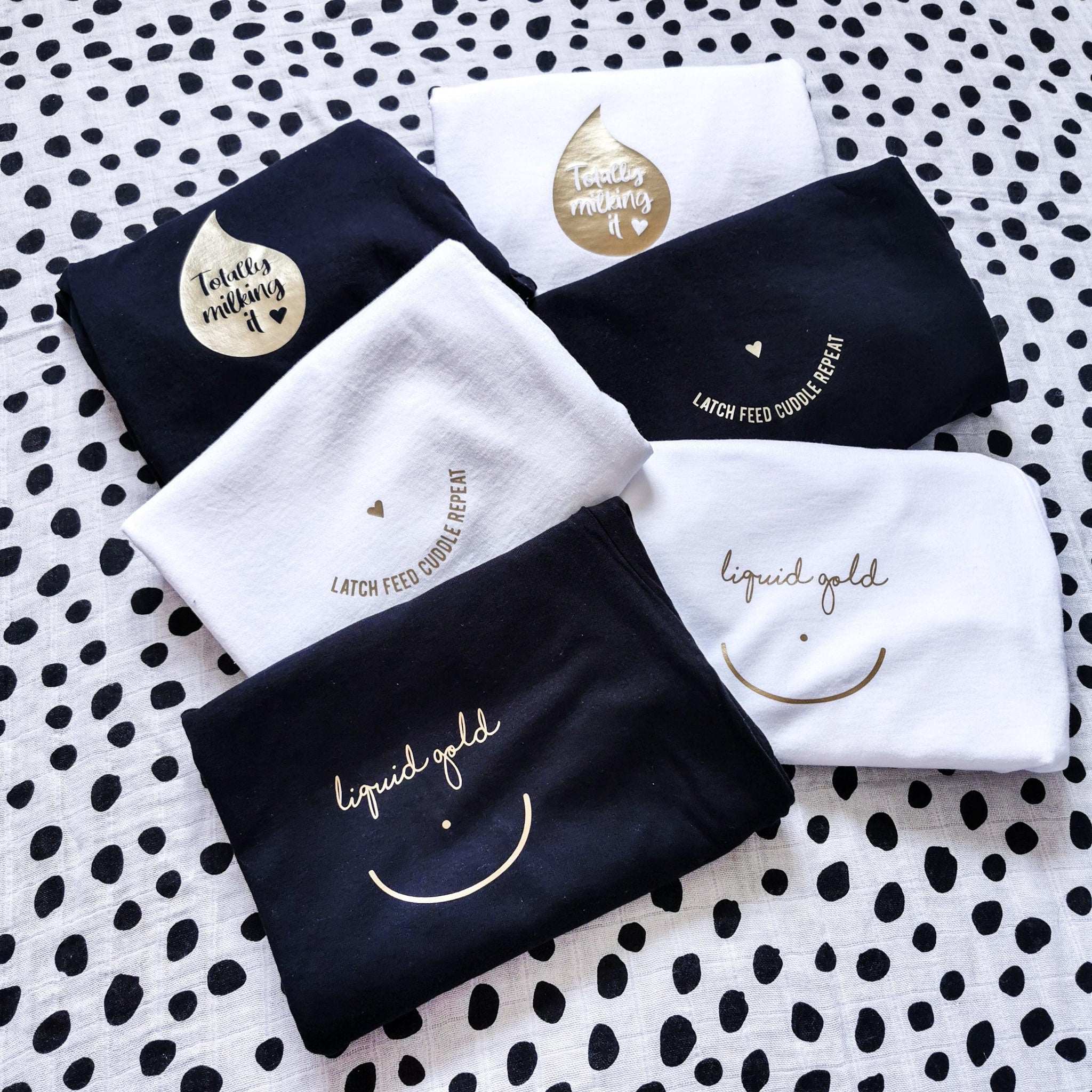 The fun, subtle breastfeeding slogans on the white or black T's are perfect for every day wear, tucked in jeans & rolled up sleeves, a must have addition to any breastfeeding Mamas wardrobe. The vinyl is purposefully gold to represent mamas liquid gold milk, it has a beautiful shine & it's a great way to support breastfeeding!