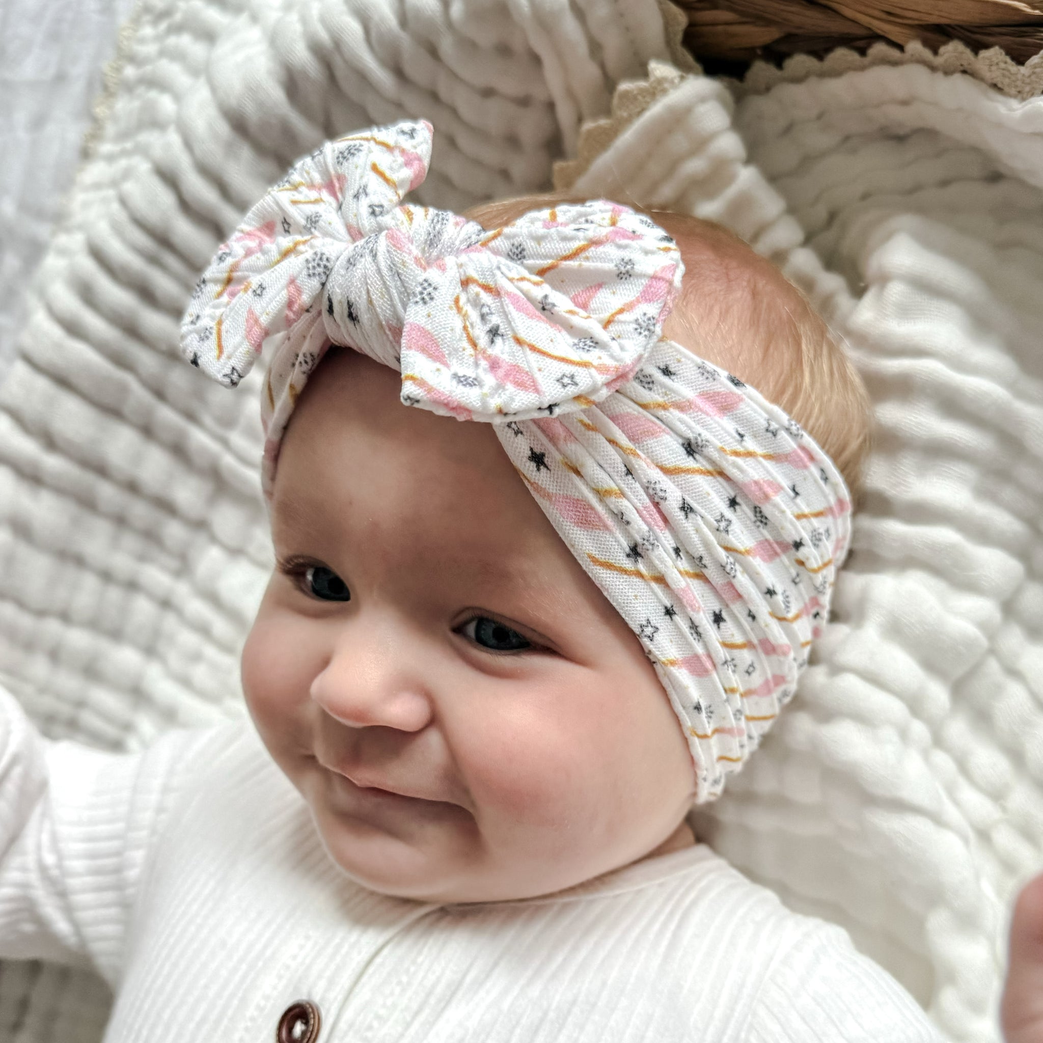 Beautiful seasonal bow, soft and stretchy nylon blend that grows with your little girl