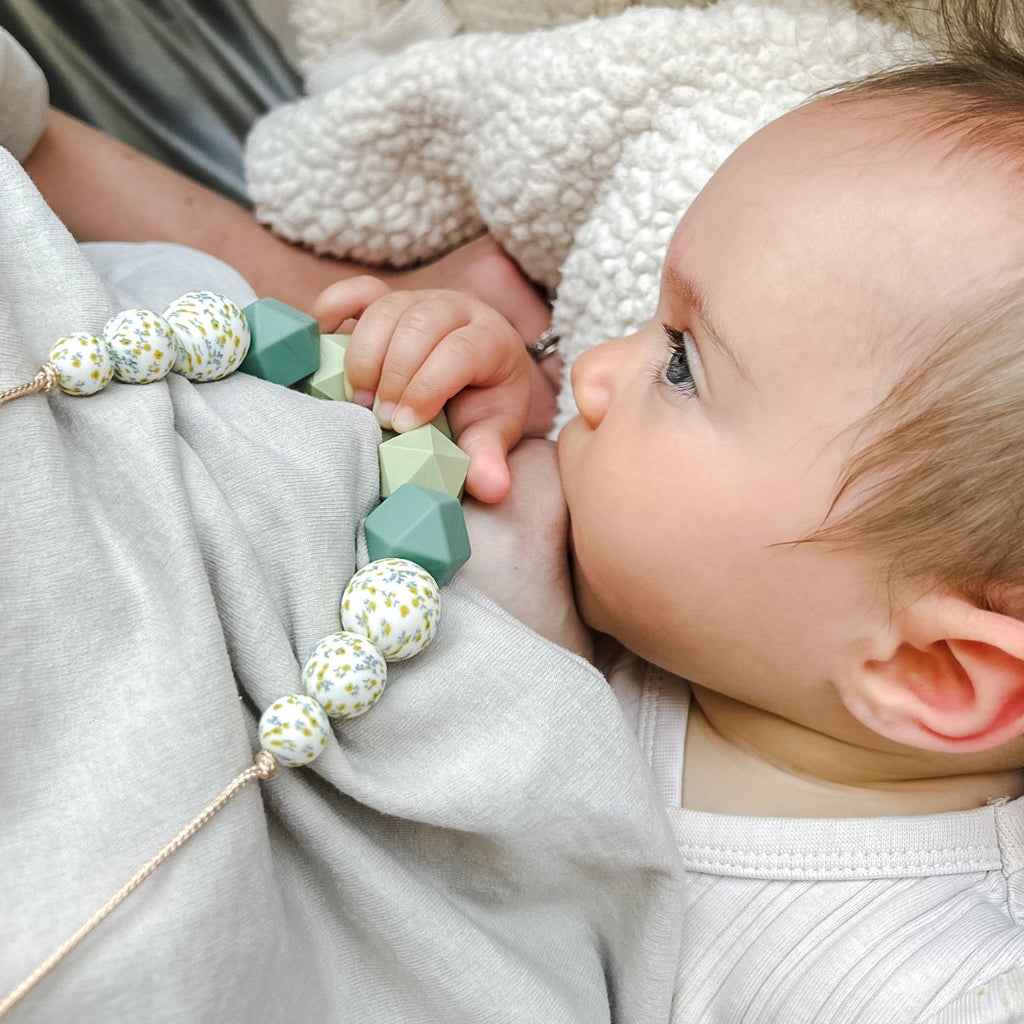 • Chewable, tactile silicone beads & interesting for baby, while stylish for mama to wear