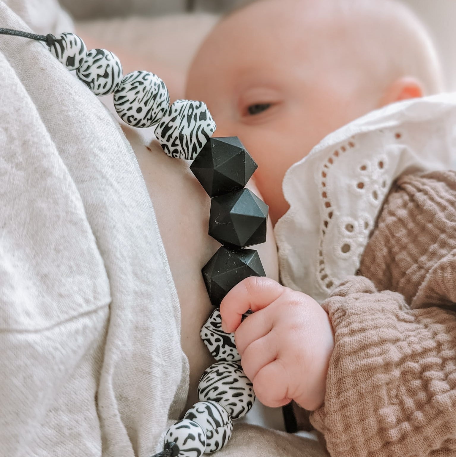 We design jewellery for your little one to chew on when teething, hold when feeding & provide sensory stimulation to maintain focus on nursing, all while looking pretty on mama! They help reduce nipping, scratching & hair pulling while snuggled up together making feeding your little one easier.