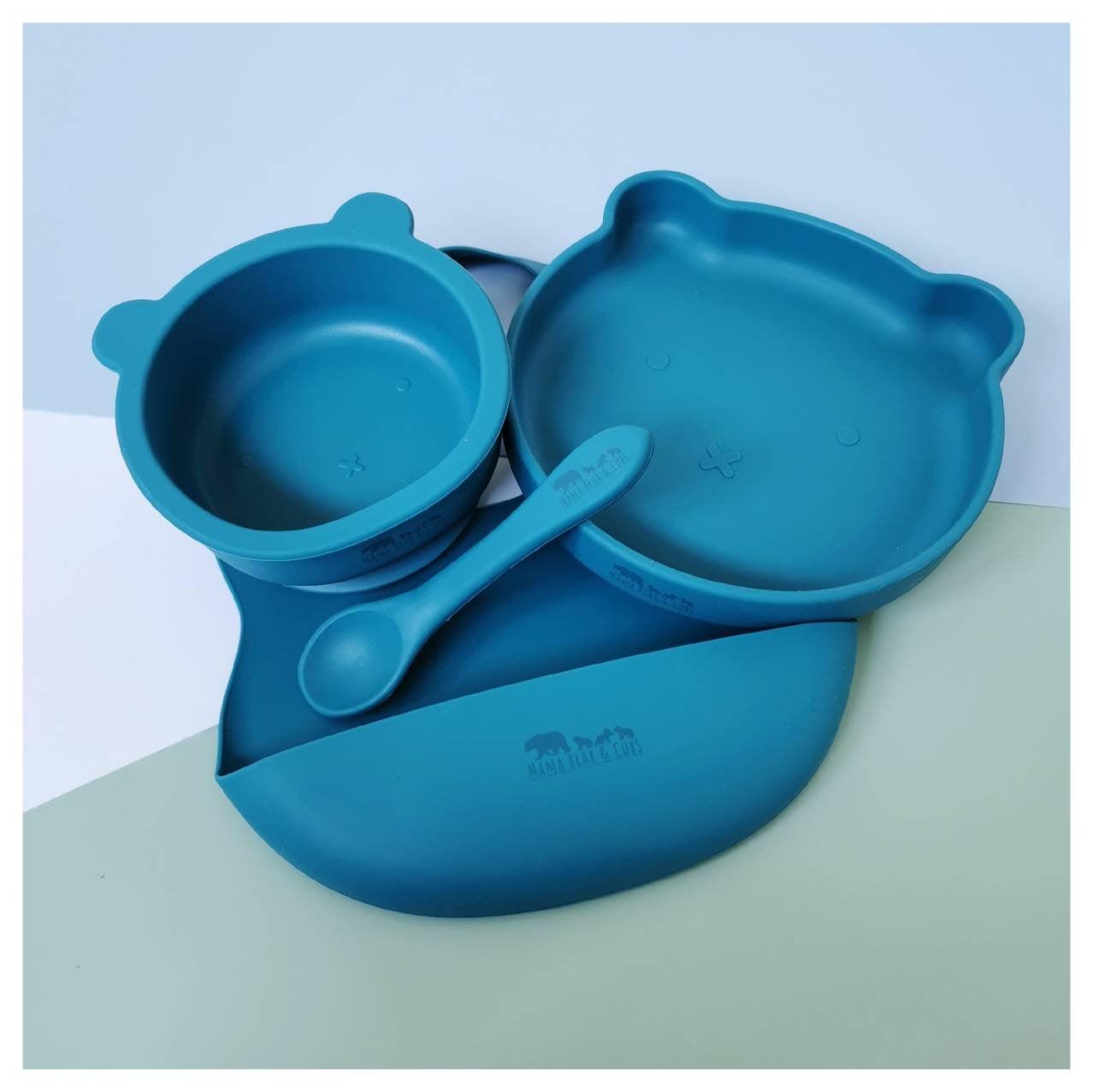 Baby silicone weaning set with suction bowl suction spoon silicone spoon silicone bib colour ocean blue teal mama bear and cubs