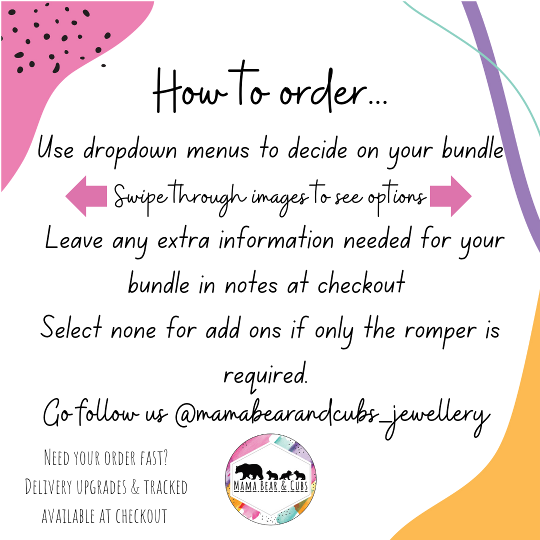 ⚠️HOW TO ORDER: See romper size & add on options from drop down menus , in notes at checkout let us know any extra information needed from you in regards to your order.
