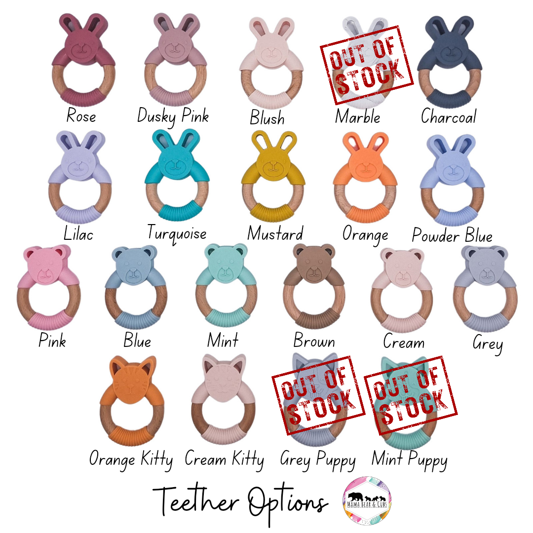 Each teether comes with a soft cotton bag with our logo on to store away when not in use. You will also receive a baby tooth eruption chart which allows you to keep a record of when your babies teeth come through, as well as giving you a guide to what age you should expect certain teeth to erupt.